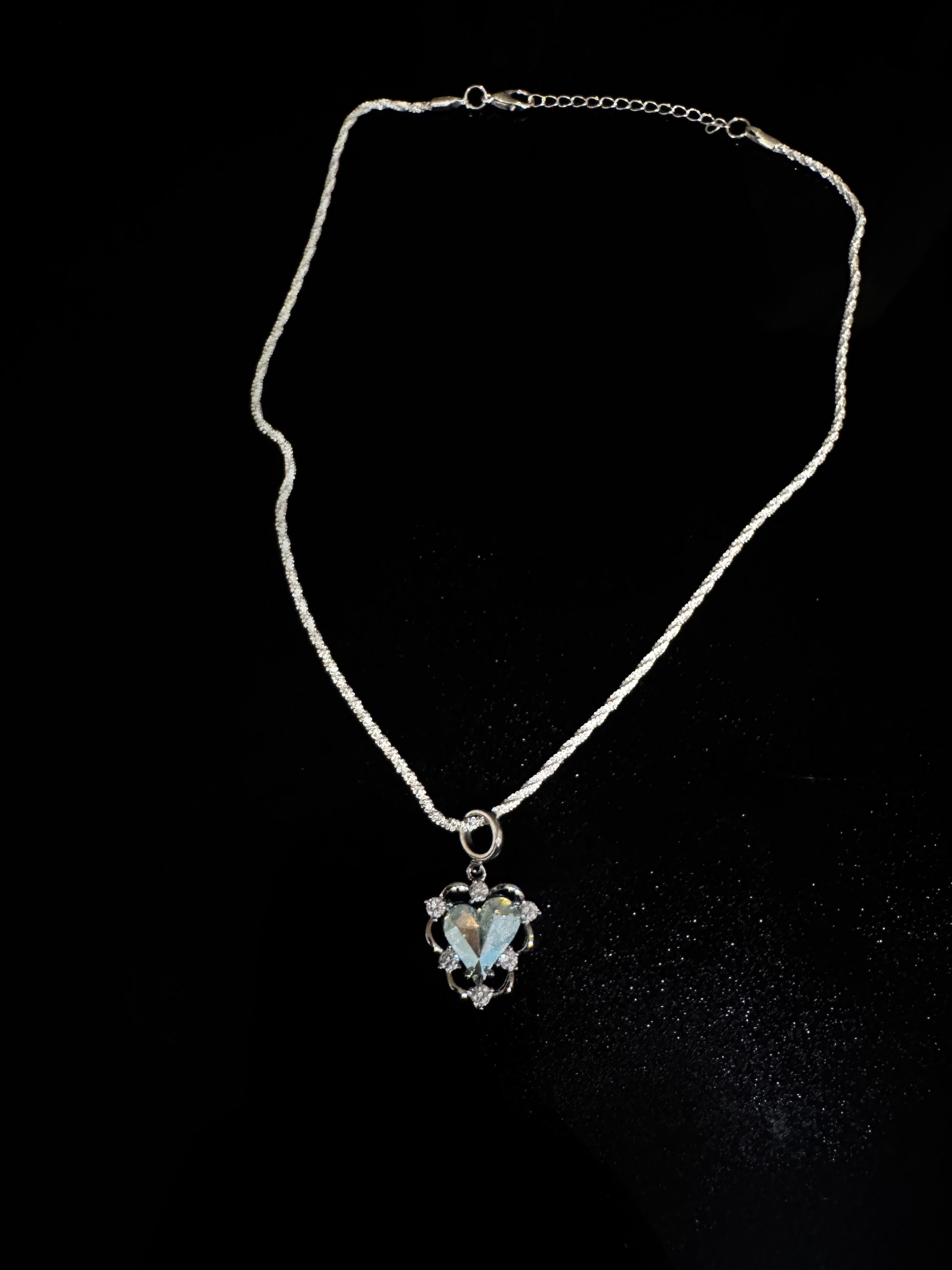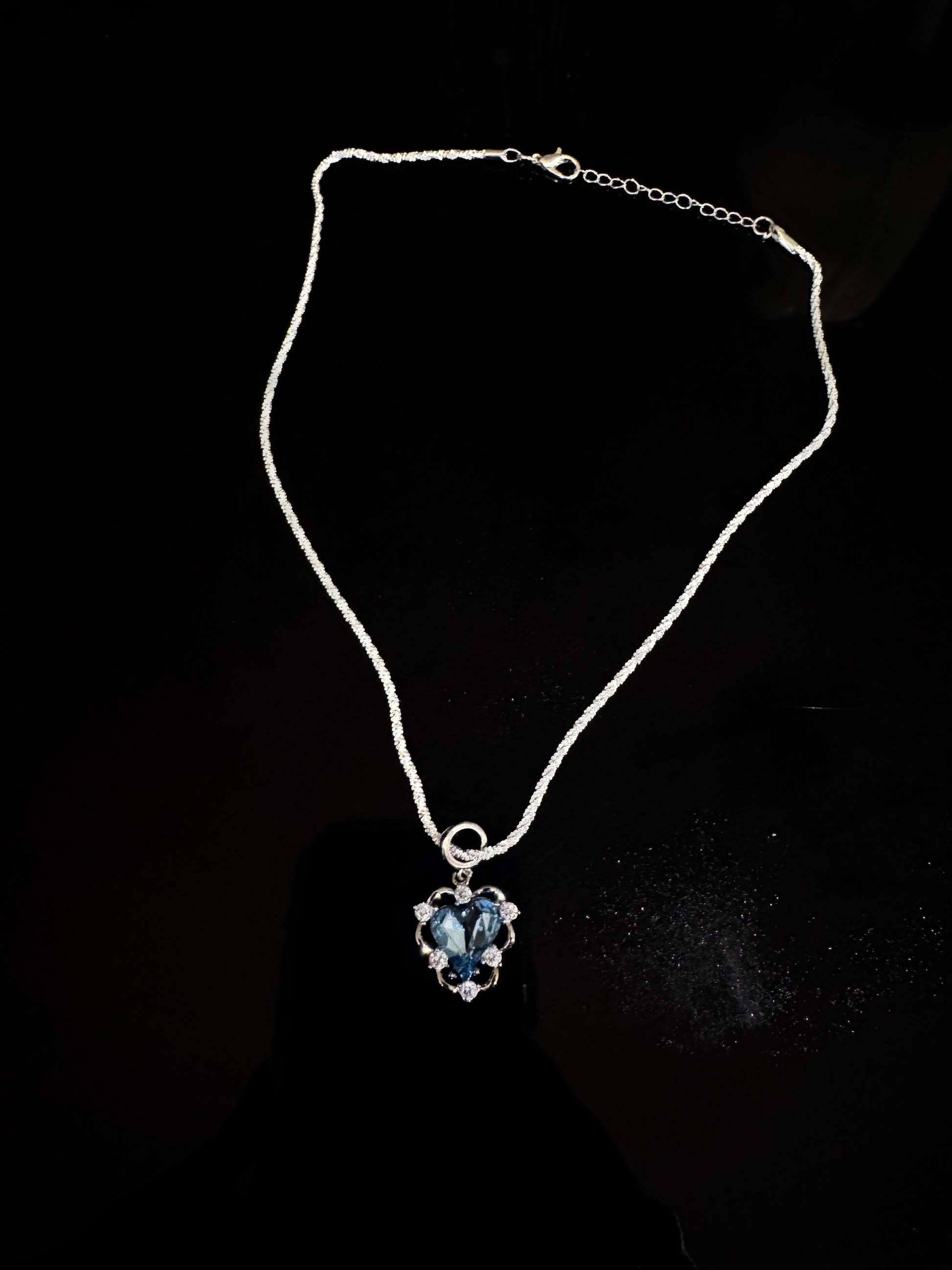 The icy-blue gem glimmers with the purity of frost, surrounded by diamonds that sparkle like falling snow.